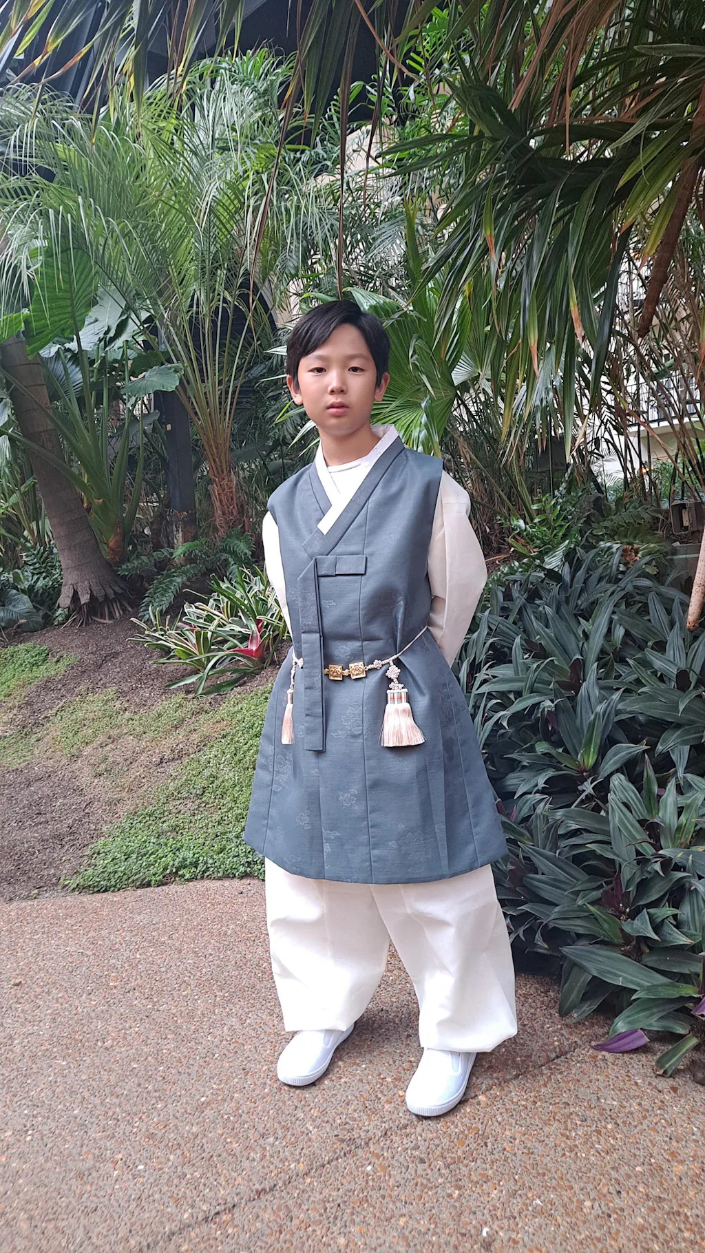 - Includes: Jeogori (inner top), khaki vest, and ivory pants.