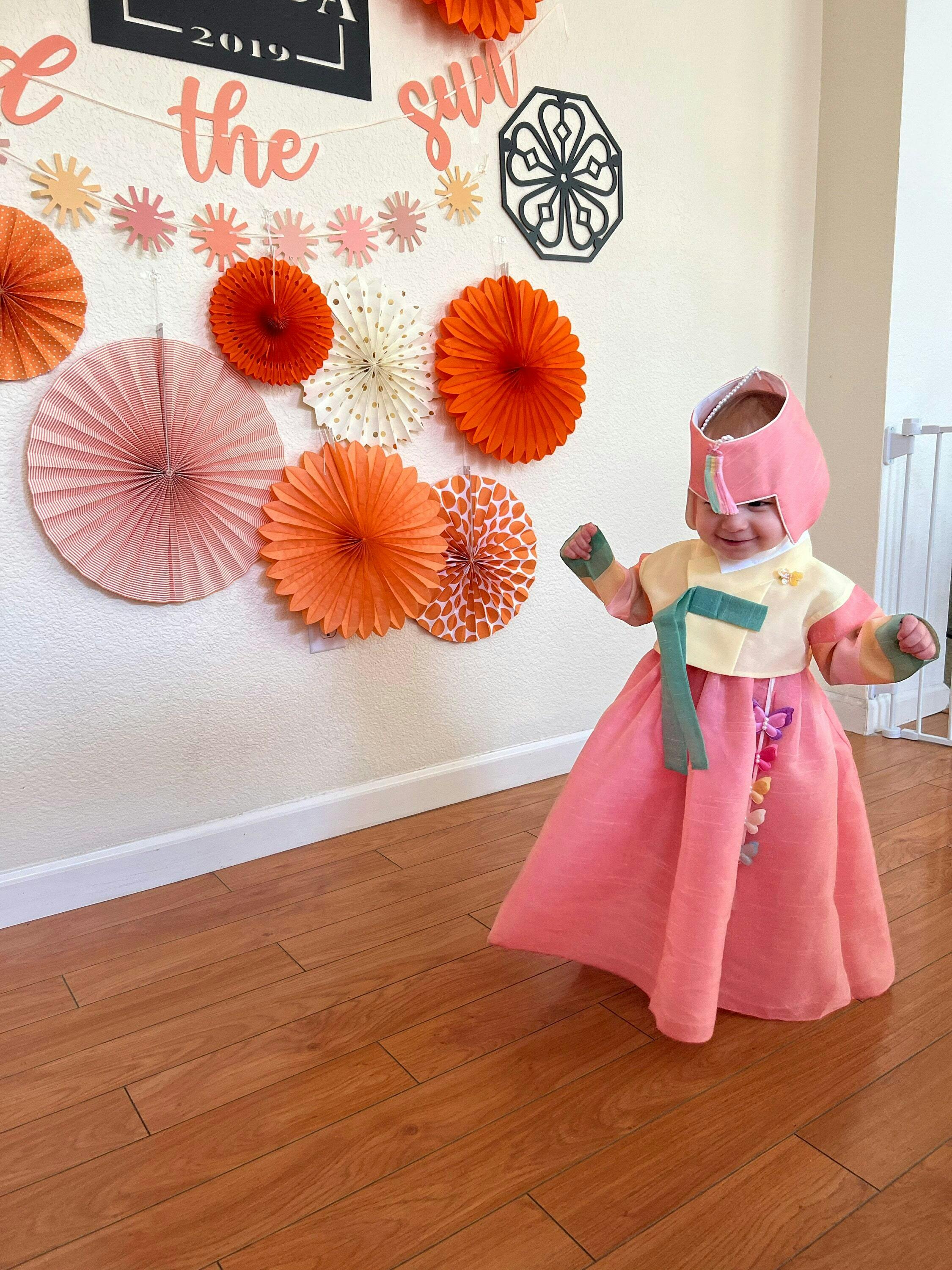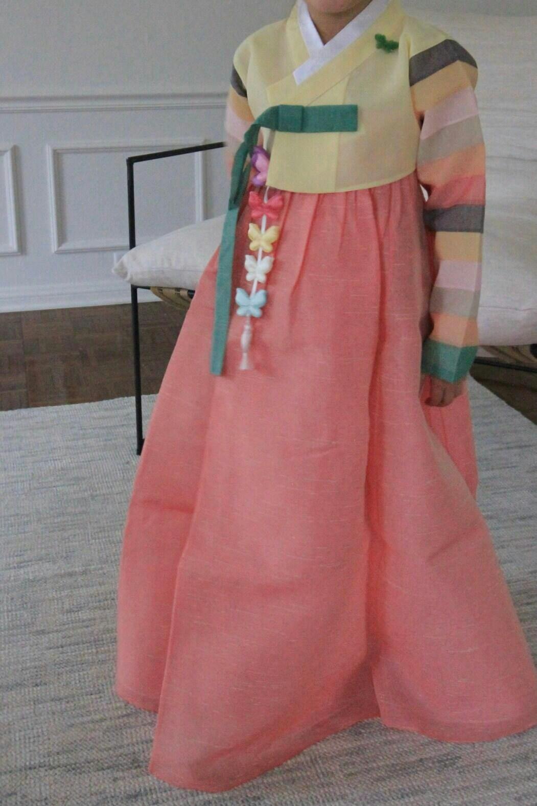 Adorn your girl with the timeless elegance of our Kahyun Peach Yellow Jeogori Girl Hanbok. Ideal for Dol, Baek-il, and other festive occasions, this hanbok seamlessly blends tradition with contemporary comfort